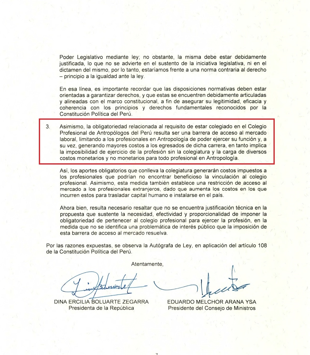 PODER EJECUTIVO OBSERVA MODIFICATORIA DE LA LEY N° 24166 DEL COLEGIO PROFESIONAL DE ANTROPÓLOGOS DEL PERÚ